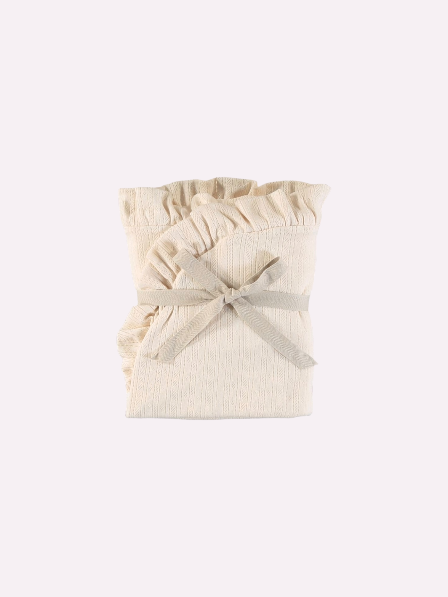 Arrullo con un diseño bohemio y delicado, con interior de rizo fino muy suave y exterior calado. Una prenda muy dulce ideal para arropar al bebé en brazos o en el carrito. Mide 80 x 80 cm y está fabricada con algodón orgánico GOTS 100%.