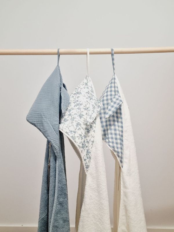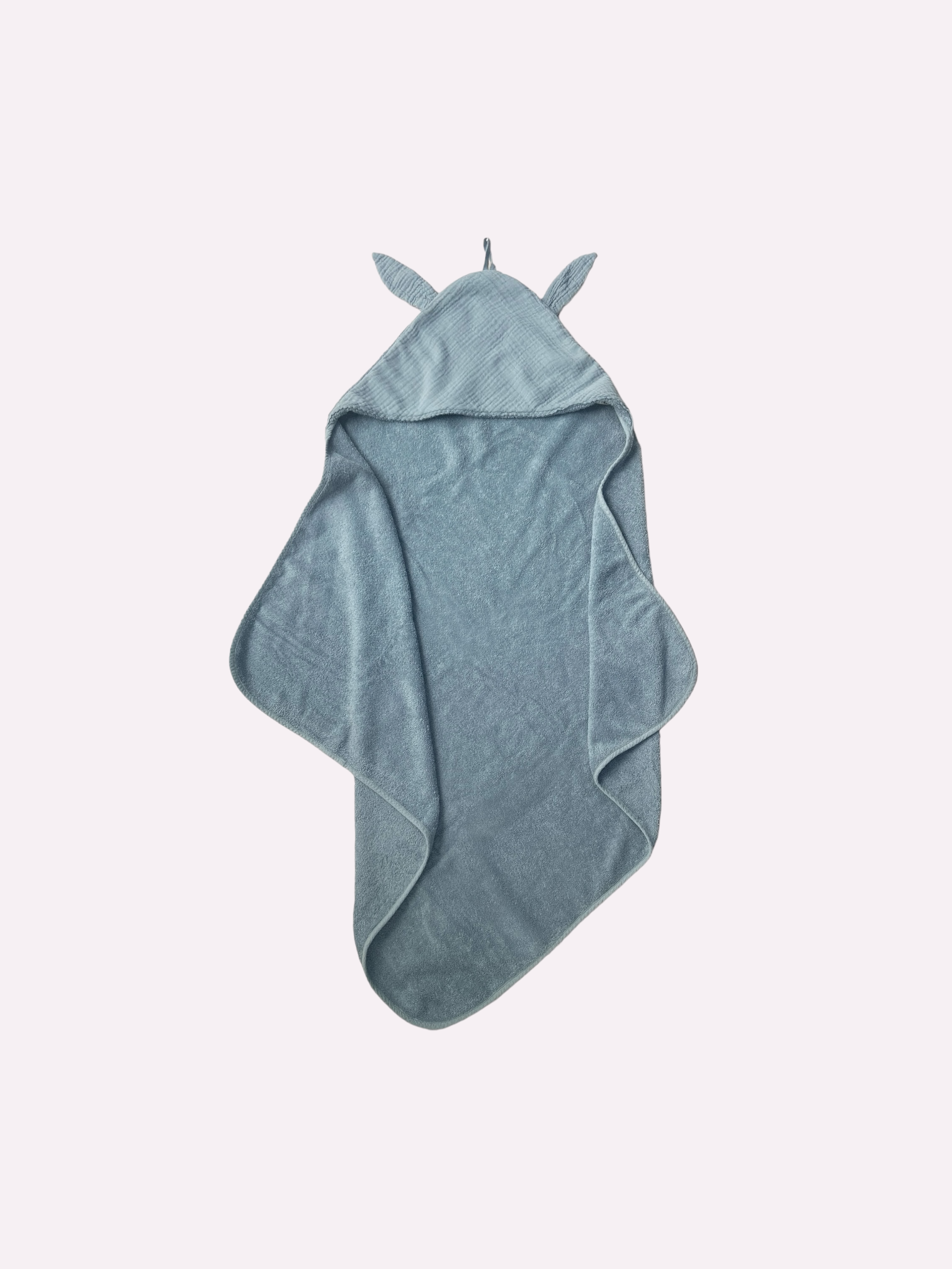 Para la tierna hora del baño aquí tienes esta capa en tejido de rizo de algodón orgánico GOTS 100%. Tiene dos bonitas orejas en la capucha, borde ribeteado y tira para colgarla cómodamente.