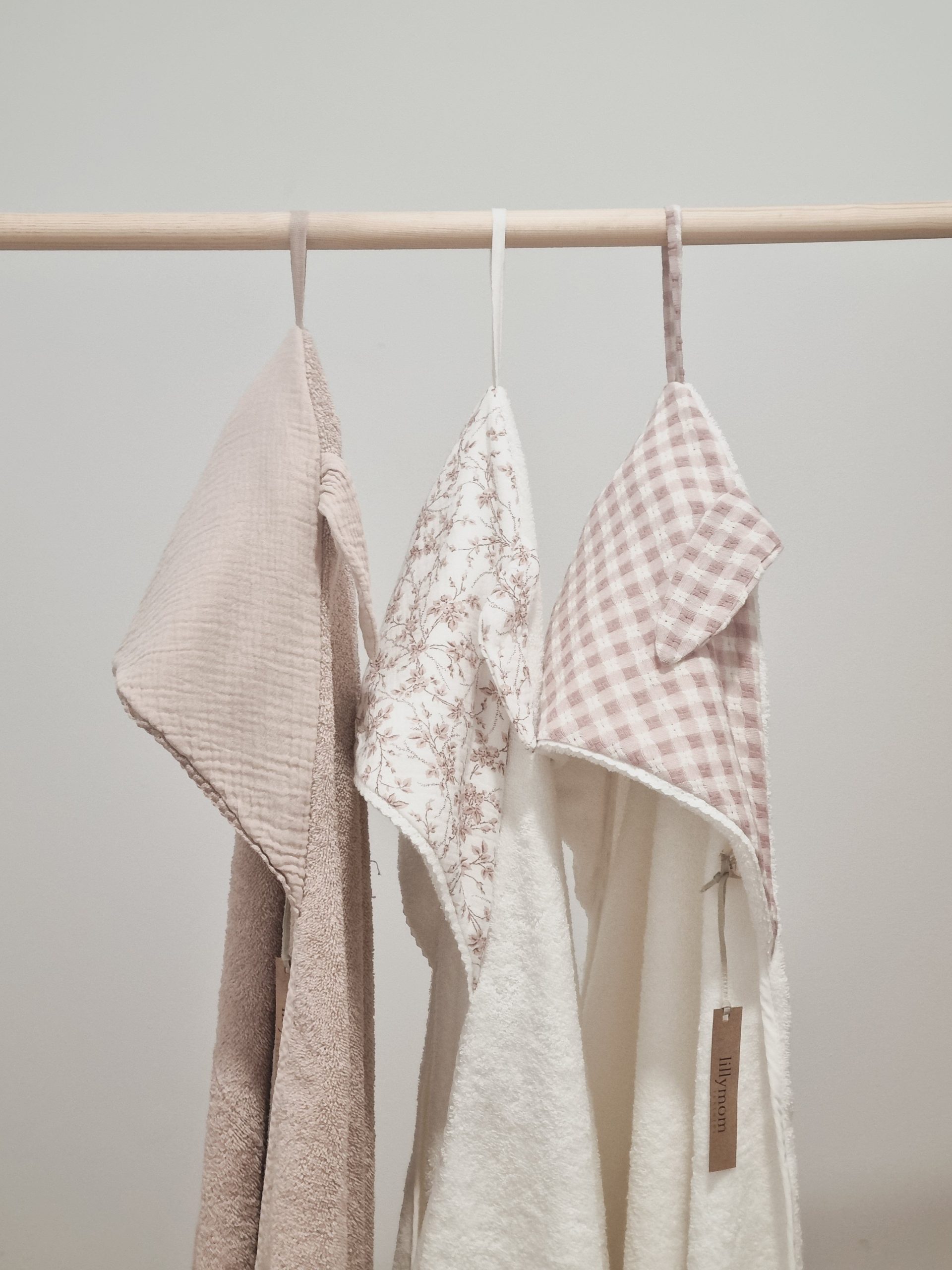 Para la tierna hora del baño aquí tienes esta capa en tejido de rizo de algodón orgánico GOTS 100%. Tiene dos bonitas orejas en la capucha, borde ribeteado y tira para colgarla cómodamente.
