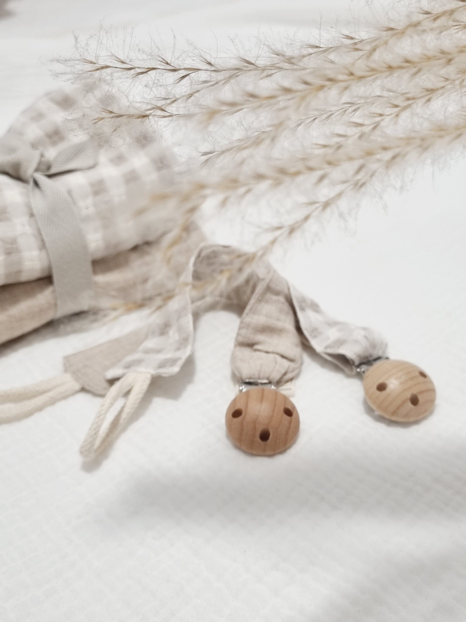 Chupetero de algodón orgánico y madera. Muy bonito para complementar un regalo a una mami, además combina con los tonos «nut» de otros accesorios como las toallitas o los arrullos. Y también con los conjuntos calados en tono «nut».