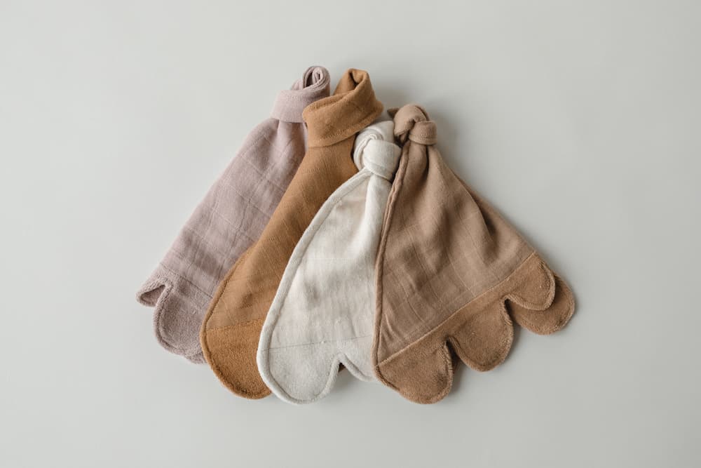 Pañito de algodón orgánico con tejido de muselina y velour, para que el bebé pueda sostenerlo y abrazarlo mientras descubre diferentes sensaciones y texturas.