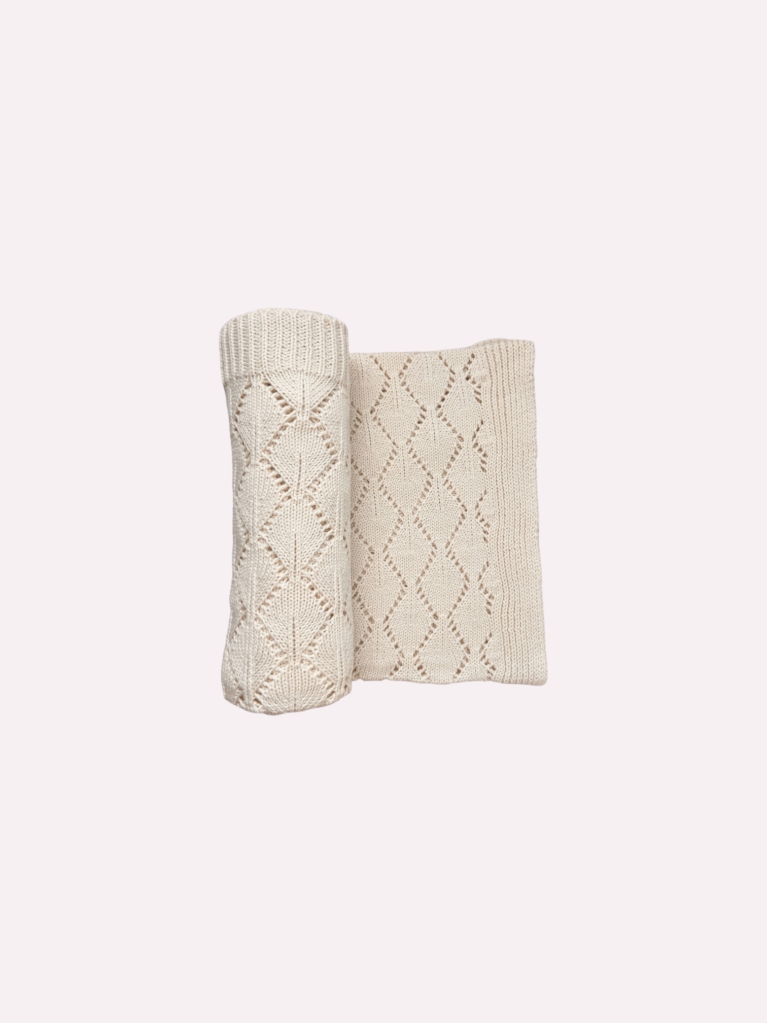 Mantita de punto suave, en algodón 100%. El punto hace un nudo muy bonito y calado de estilo boho. Mide 80 x 80 cm.
