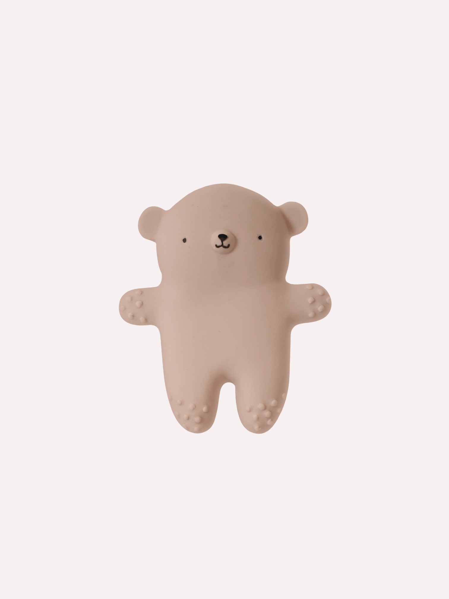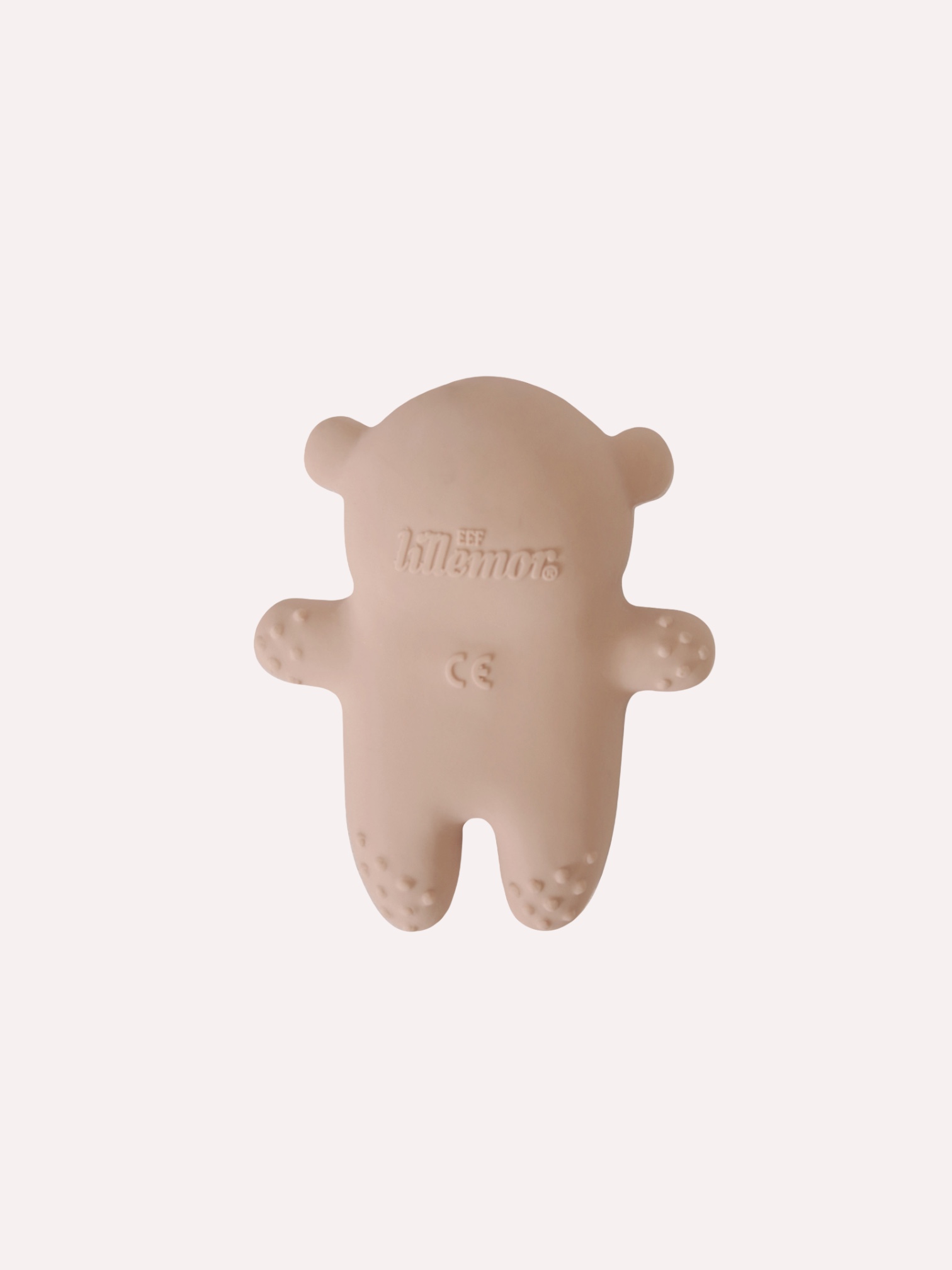 Mordedor de caucho natural y diseño adorable con forma de osito, flexible y con pequeños relieves que masajean las encías del bebé.